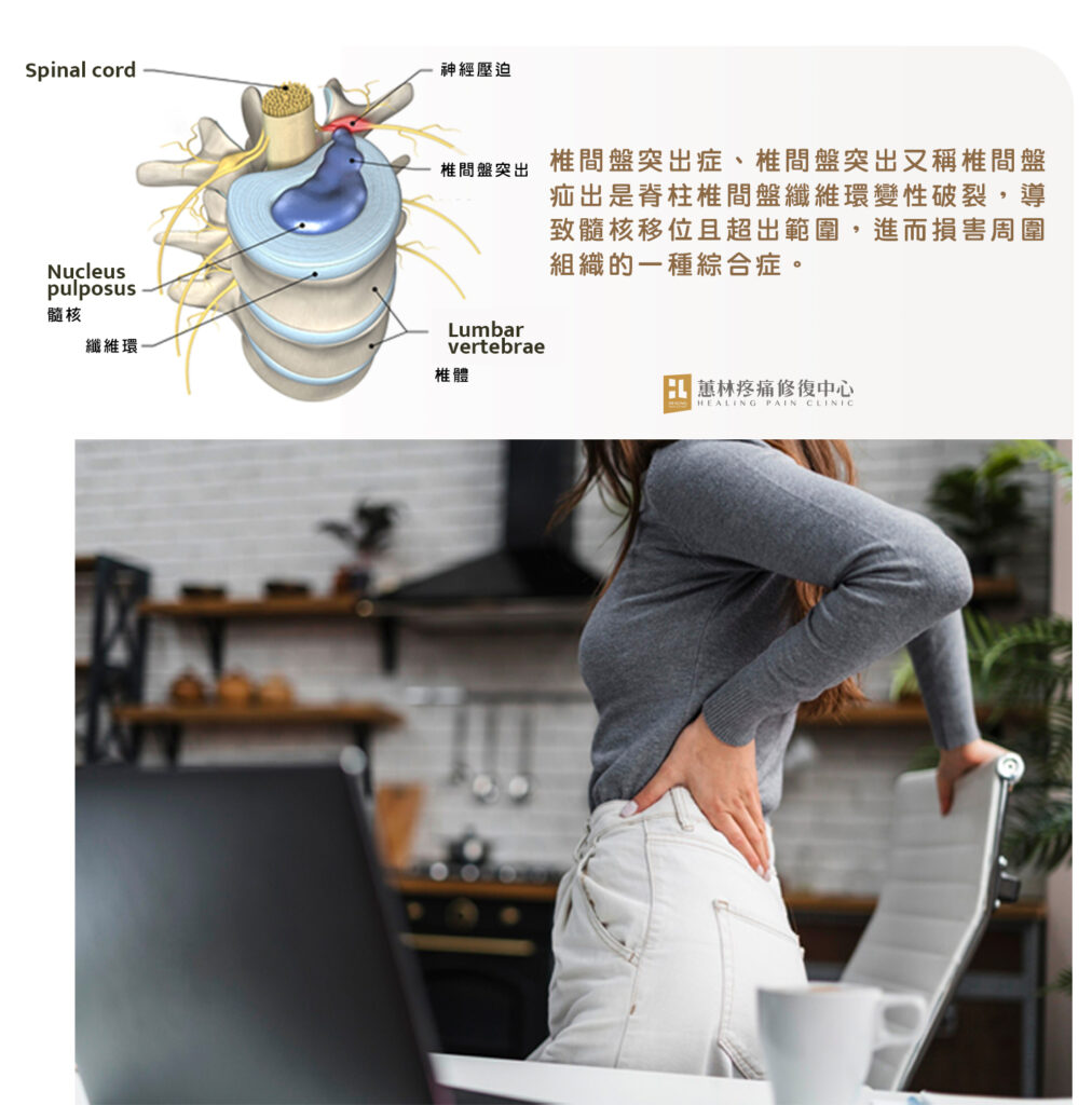 椎間盤就像充了氣的游泳圈,受壓時會變形,椎間盤破裂時會痛在屁股跟大腿,若已經嚴重突出刺激到脊椎神經根,疼痛刺麻感就會延伸到腳。依據不同節數影響的神經皮節不同,病人會覺得麻痛的位置也會不一樣,就診時與醫師詳細敘述您的病情,有助於醫師診斷。