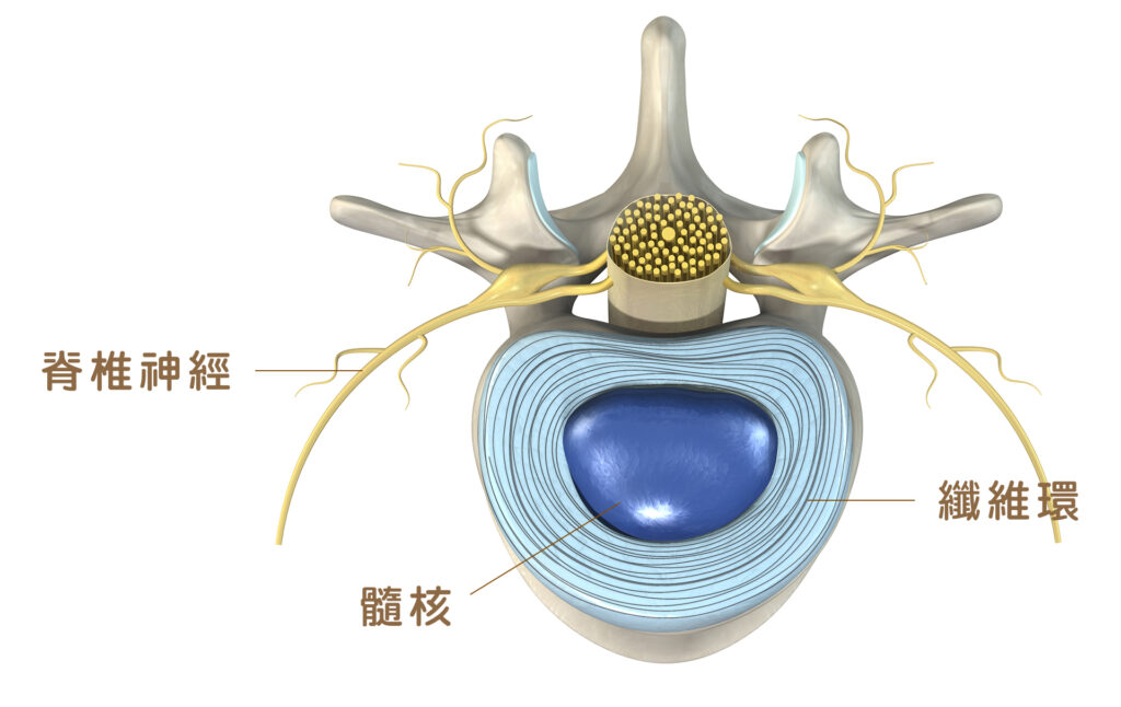 椎間盤突出(herniation of intervertebral disc) 是什麼?人體脊椎分為頸椎、胸椎、腰椎,前方的骨頭叫做椎體(vertebral body)」,椎體與椎體間則夾著環狀軟組織,這些軟組織就是 我們說的椎間盤。椎間盤由外圍堅韌的纖維環(Annulus Fibrosus) 包圍著中間像果凍一般的髓核 (Nucleus Pulposus),上下連接脊骨間則有由軟骨組成的椎終板 (Vertebral End Plate) ,健康的椎間盤就像充滿氣的氣墊,堅韌而富彈性,協助支撐身體重量並吸收和轉移衝擊。