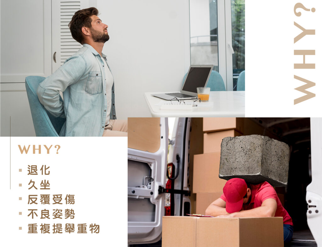 穩定而有力的脊椎可以避免力量過度集中擠壓椎間盤,導致椎間盤受損退化。脊椎的穩定來自於軟組織、小面關節與核心肌群,除了下背的核心肌群以外,還需要訓練臀部大腿的肌群,從骨盆提供穩定的支撐,才能讓我們姿勢更正確。