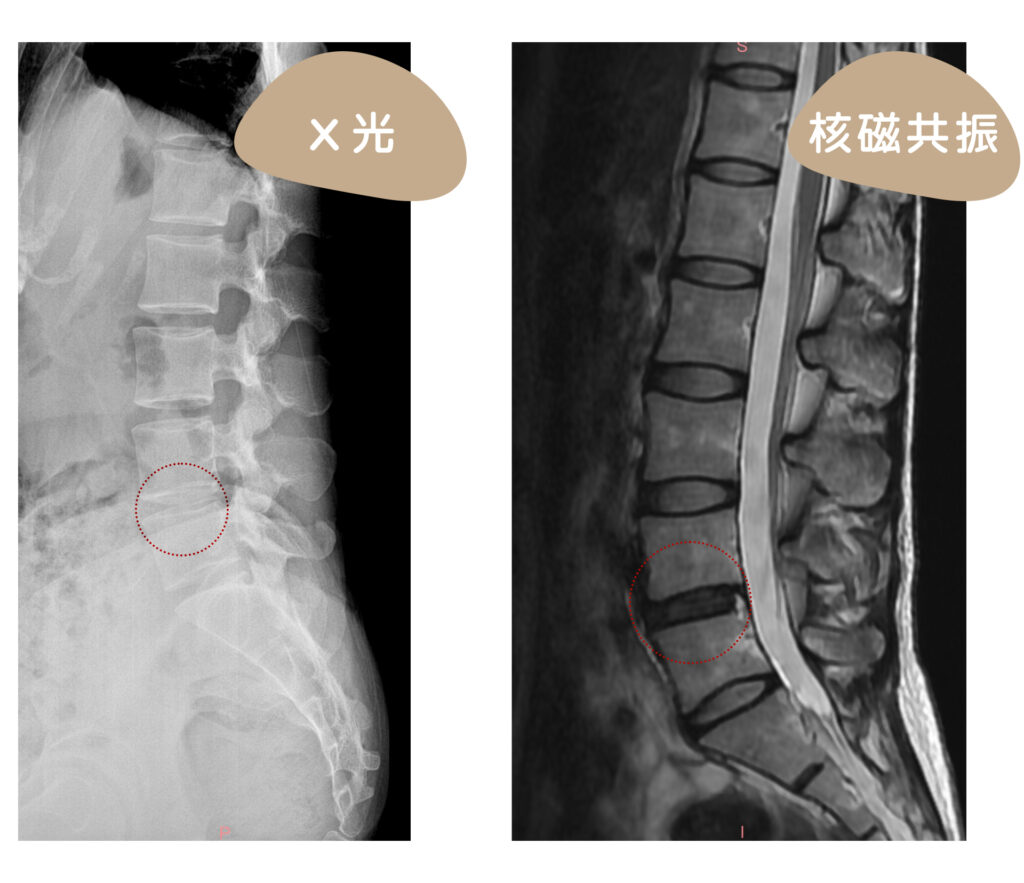X光只有等到脊椎長骨刺之後才能從增生骨以及高度減損間接得知脊椎健康度。其實脊椎常見的問題諸如:小面關節、韌帶受傷、椎間盤破裂都無法從X光上得知,還是得由醫師進行深入而詳細的檢查,並安排諸如核磁共振掃描、高解析度超音波掃描等等針對軟組織的檢查,才能找出真正病因,對症治療!