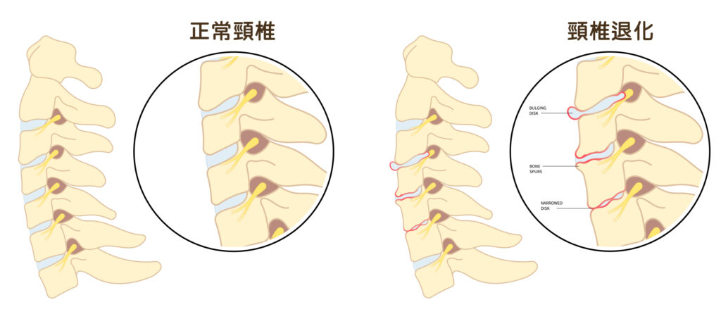 頸椎與腰椎是最容易退化受傷的兩個部位,頸椎椎間盤突出會出現後頸痛、膏肓痛、肩頸痠麻甚至手麻無力的狀況,頸椎失去彈性與支撐力病人轉頭仰頭低頭可能會引發疼痛,肌肉也會為了協助支撐脊椎而出現緊繃僵硬的情形。